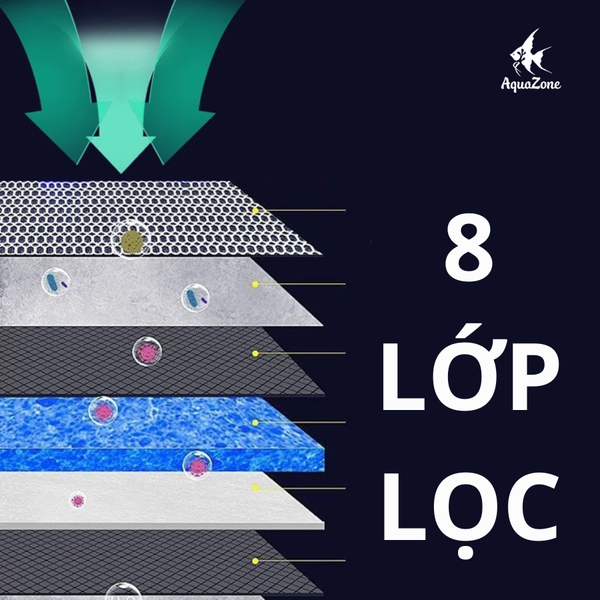 - Tấm lọc bể cá 8D được tích hợp 8 lớp vật liệu lọc khác nhau, trong đó có 2 lớp lưới cao su ở hai mặt, giúp định hình tấm vật liệu sau thời gian dài sử dụng và vệ sinh bảo trì. Do đó, tấm bông lọc 8D có tuổi thọ cao hơn rất nhiều so với các loại bông lọc nước hồ cá thông thường. Cấu trúc của một tấm lọc 8D bao gồm: